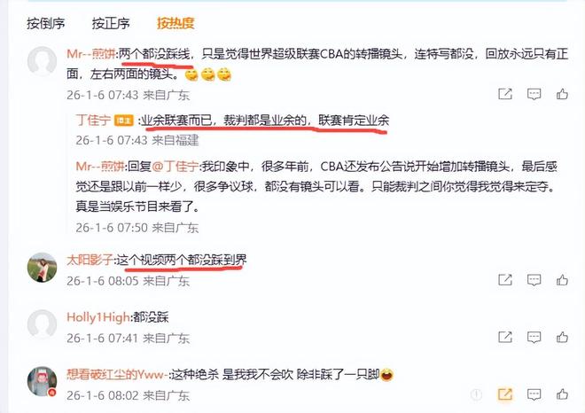 有球迷对此进行评论,“两个都没踩线,只是觉得世界超级联赛CBA的转播镜头,连特写都没,回放永远只有正面,左右两面的镜头。”丁佳宁与这位球迷互动时说:业余联赛而已,裁判都是业余的,联赛肯定业余。虽然丁佳宁没有直接说踩不踩线,但是他说的话显然认同了球迷的看法,那就是两人都没有踩线。