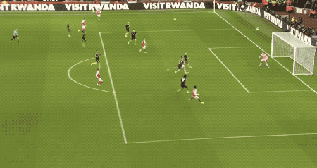 赖斯开出任意球,苏维门迪力压卡塞米罗头球攻门,拉门斯做出神勇扑救。